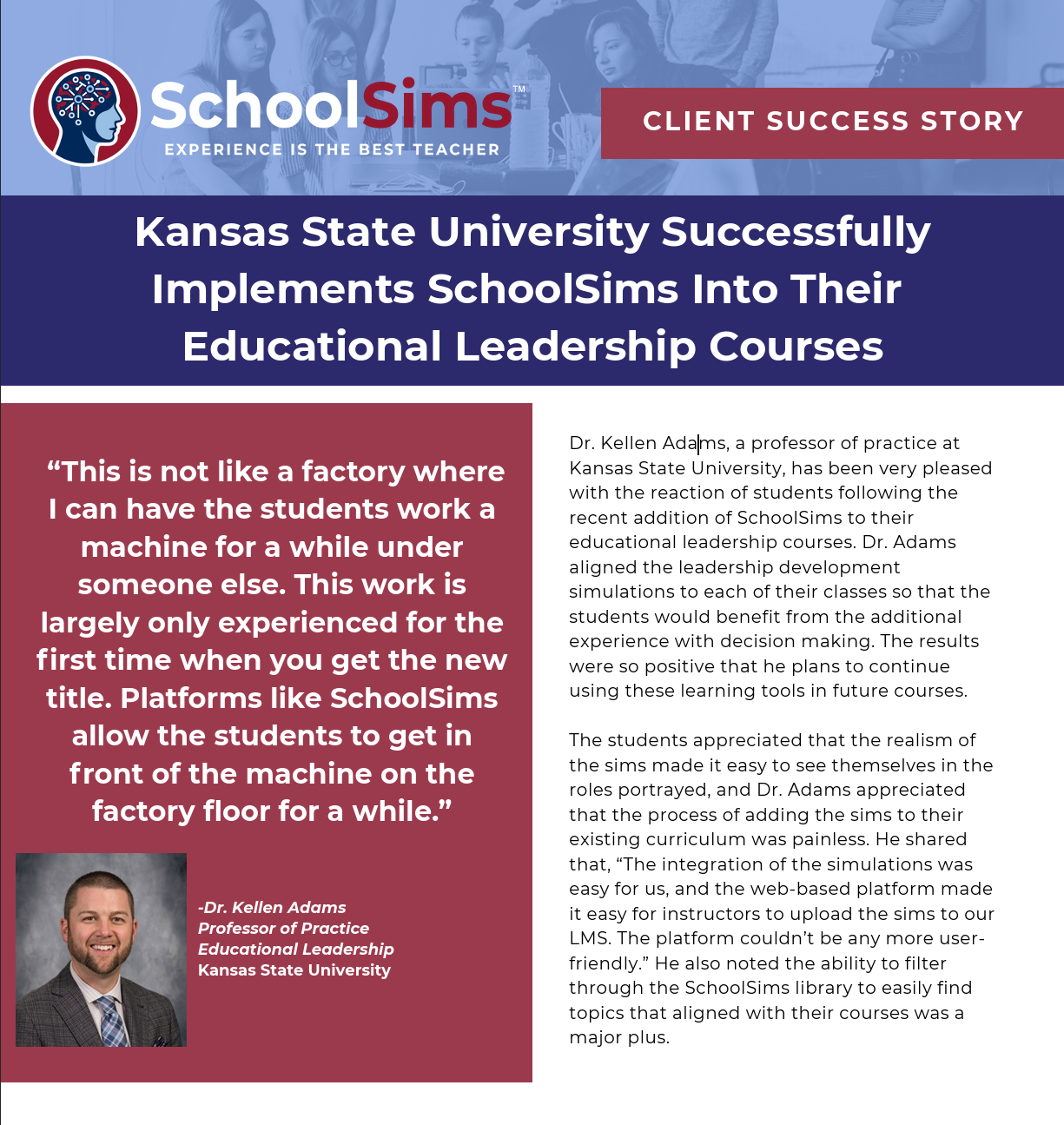 Unlock exclusive testimonials and insights by downloading the full success story. This downloadable PDF contains compelling testimonials and detailed examples of how SchoolSims has transformed leadership development at Kansas State University. Gain a deeper understanding of the impactful simulations and their benefits, and share this valuable content with colleagues and peers who could benefit from these insights.